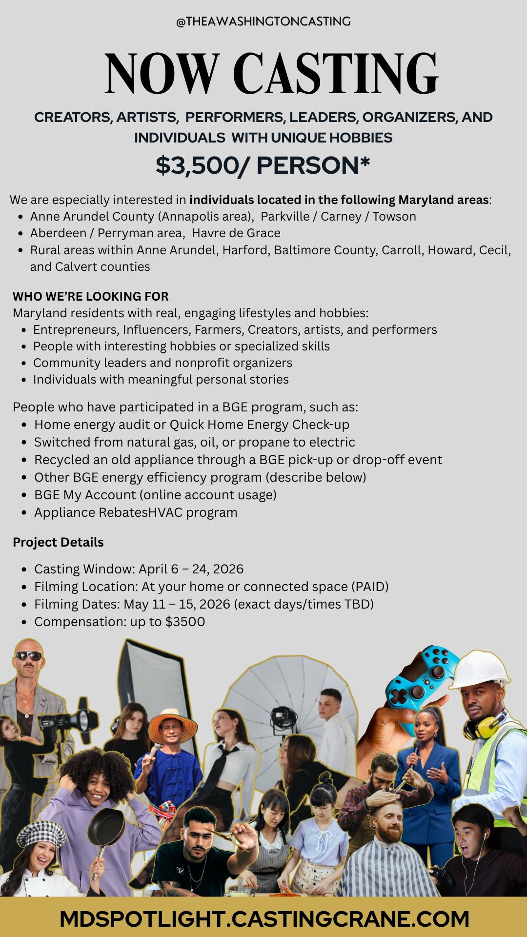 Thea Washington Casting is partnering with BGE to find community members with unique stories, talent, passions, and real-life experiences, particularly those who have participated in a BGE energy efficiency program and want to share how it impacted their home and life.
